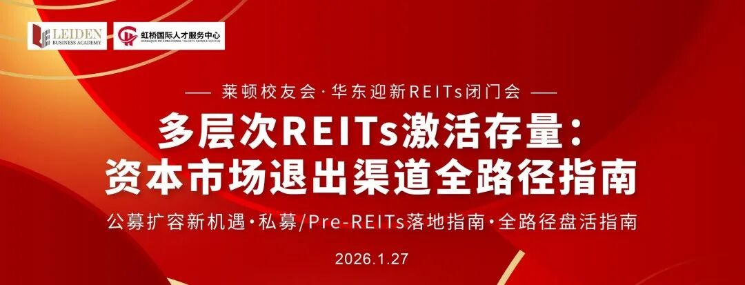 1月27日,在虹桥国际人才服务中心大力支持下,莱顿商学举办了一场聚焦REITs领域的闭门研讨会,主题为《多层次REITs激活存量:资本市场退出渠道全路径指南》。本次闭门研讨会由来自瑞安、苏州城投、招商商管、中信证券、信悦资管、中国金茂、浦东软件园、香港置地、中国电建、和泓集团、万科商办、爱琴海商管、象屿商发、金科集团、宁朴发展、陆家嘴集团、中金证券、JLL仲量联行、森兰商运、凯德、东原致新、申寿润、建发、策一繁楼、复旦金融、上海电气、华之门等企业百余人参与。
