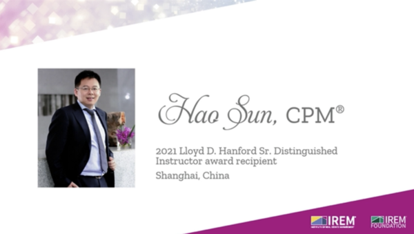 近日,IREM国际资产管理协会(以下简称 IREM)在拉斯维加斯 2021 年IREM 全球峰会上宣布,孙浩先生荣获 2021 年劳埃德·汉福德(Lloyd D. Hanford)杰出讲师奖——年度唯一,以表彰他在资产管理行业专业教育中的卓越表现,成为自IREM 基金会设立全球杰出讲师奖30多年来首位获奖的CPM中国讲师。2021年中国经济在疫情冲击之下展现出了强大的韧性,对比世界其他主要经济体,中国已经从疫情带来的经济停摆中走出来,步入疫情防控与经济复苏并行、社会发展重回正轨的道路上,中国资产管理行业的发展欣欣向荣,CPM国际注册资产管理师的学员与去年同期相比有100%的递增,令人瞩目!