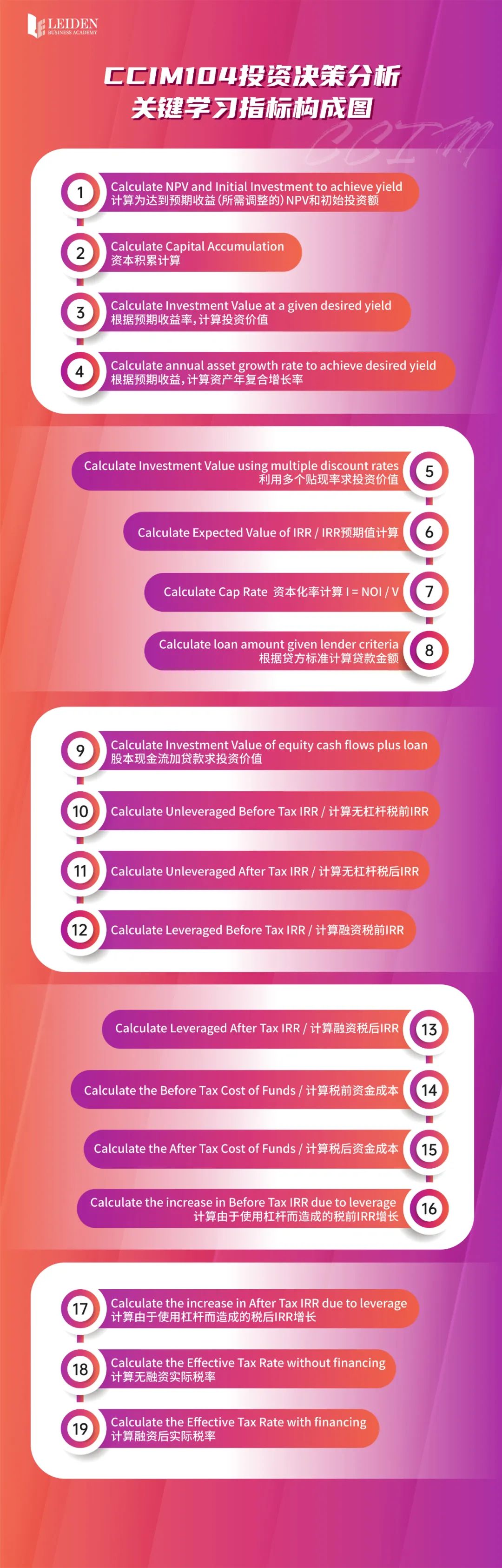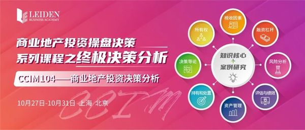 CI104课程分为八章知识内容,整个课程内容涉及两大部分,第一部分为知识体系,第二部分为案例化教学。课程以商业地产投资过程中的整体投资决策案例化视角为主轴,通过投资决策导论中的空间市场与资本(投资)市场比较和资本化率趋势分析、所有权形式、税收与折旧分析、投融资杠杆分析、风险分析、价值评估与投资比率、资产管理全案分析、以及资产持有与处置等理论内容,并结合五个典型案例研究的应用展开,帮助投资者做出最终的投资决策判断。是商业地产投资操盘决策的终极分析环节,在整个CCIM课程体系中占据极其重要的位置,是整个CCIM最后应用阶段的核心课程。