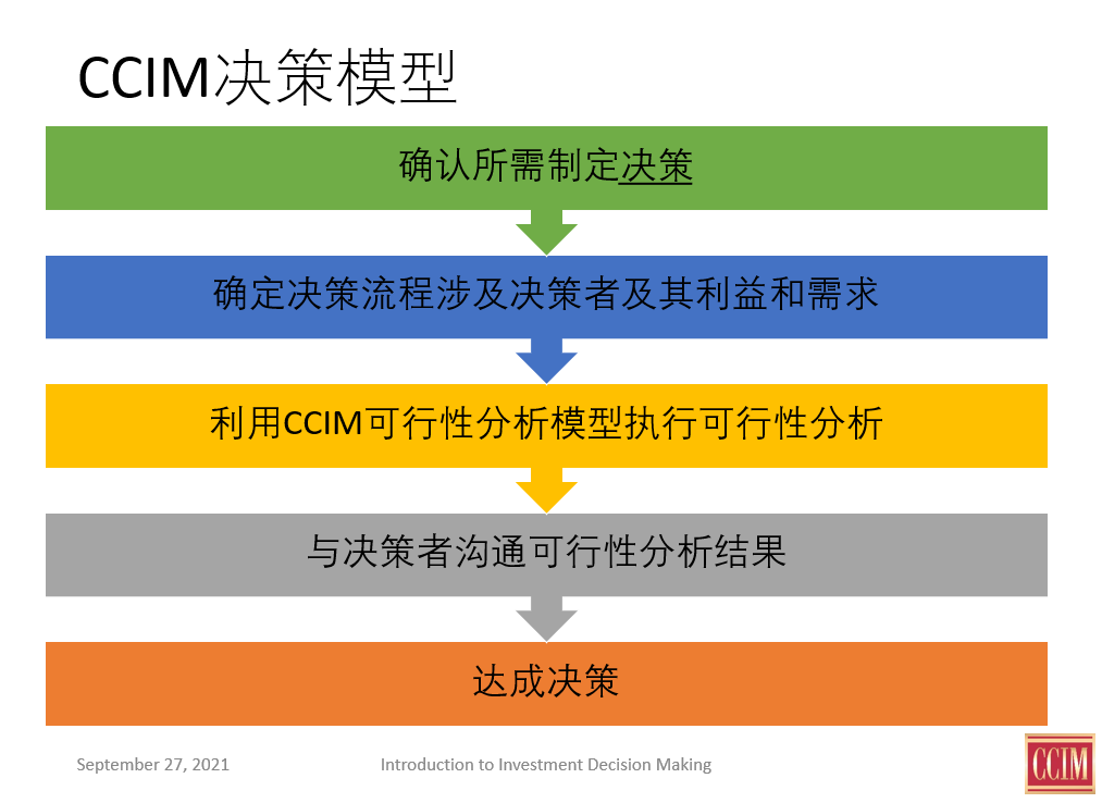 CCIM 课程相当于商业投资领域博士水平的课程知识,主要课程包括各为 5 天的四门核心专业课程:CI 101 财务分析(Financial Analysis)、CI 102 市场分析(Market Analysis)、CI 103 用户决策分析(User Decision Analysis)及CI 104 投资分析(Investment Analysis)。