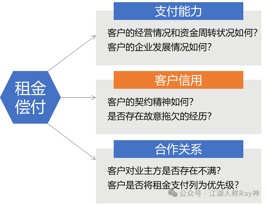 除了支付能力风险,运营团队还需要关注与客户的合作关系的风险。因为,客户在面临现金流压力时还会优先把钱付到什么地方会直接影响到我们的收缴。所以,要避免因客户关系维护不到位而导致的租费款项在客户内部付款优先级被降低的问题。此外,还要特别注意规避出现一些会被客户拿来作为拖欠租费理由的事件。
