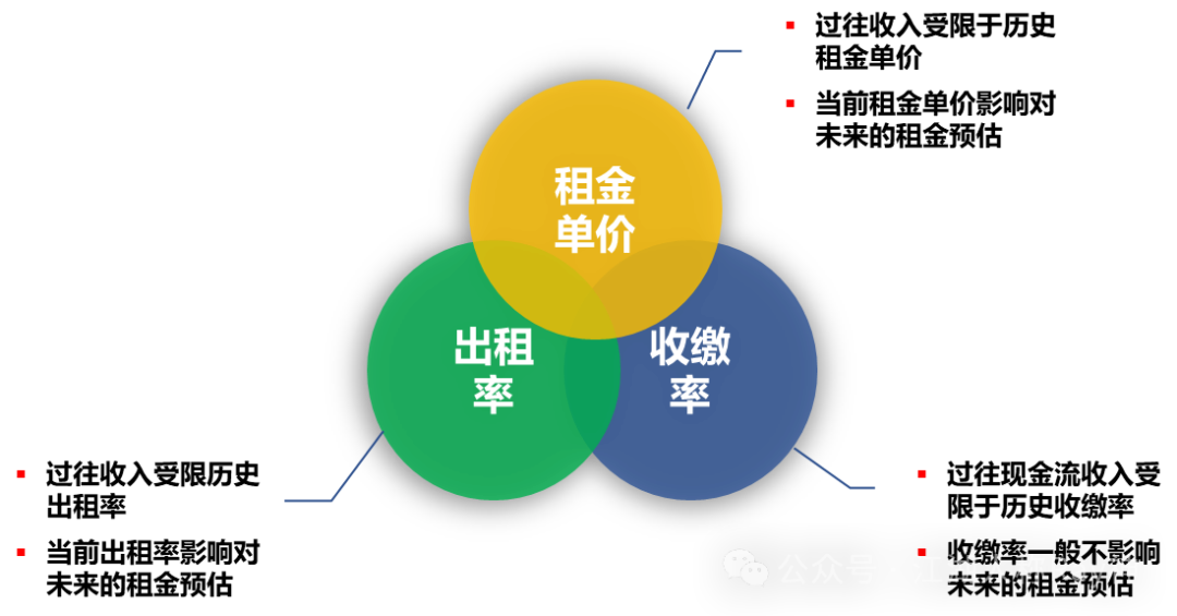 但是,需要注意的是:这里的出租率和租金单价不仅影响了当前的收入水平,还会对未来一段时间的租金收入产生影响,而收缴率却仅仅是衡量某一时间点的指标。因此,为了收缴率去进行降租,某种程度上可以说是为了当前的收入牺牲了未来的潜在收入。这对于依靠未来预期收入来撬动的资产价值而言,必然是带来负面的影响的。