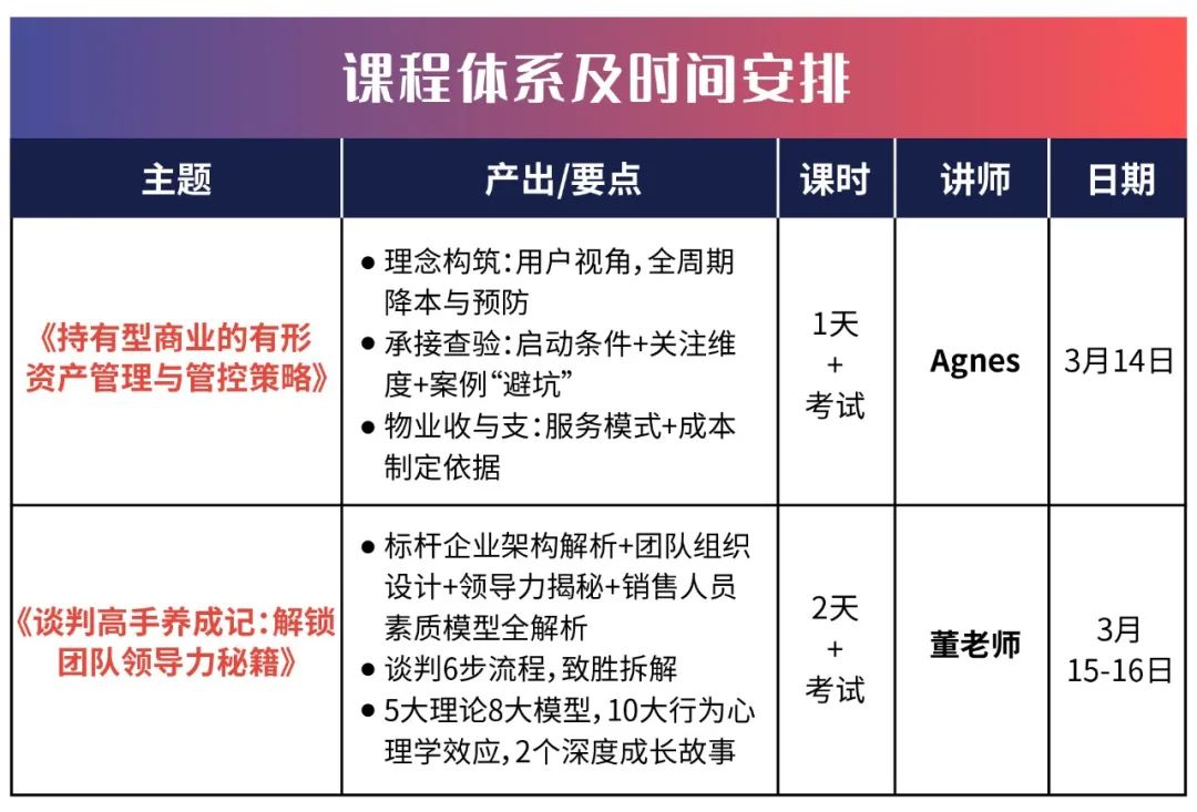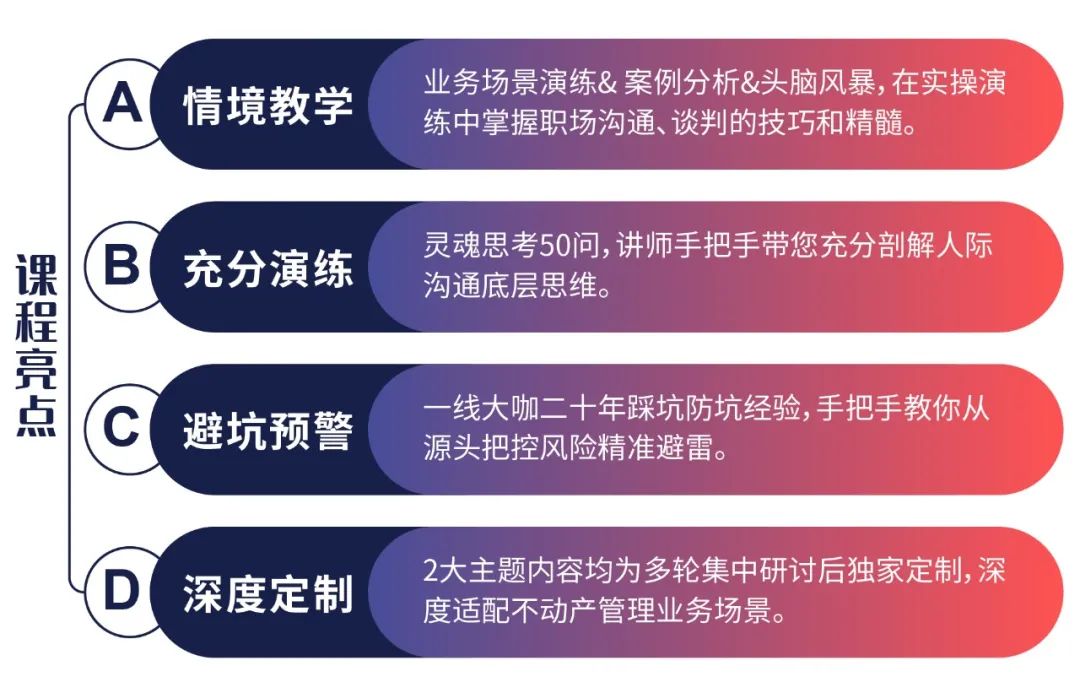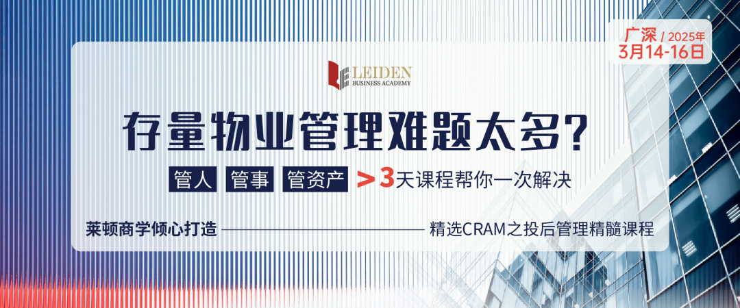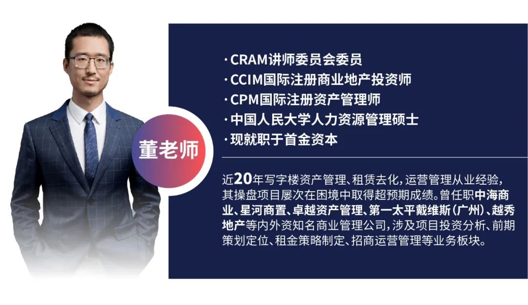 本课程聚焦不动产职场人最关心的三大管理领域——人的管理、事的管理、不动产资产的管理,精准聚焦管理者在实际工作中可能遇到的具体问题,由资深讲师带着实战经验帮您逐一剖析,打造一堂全方位的不动产管理实战培训课。