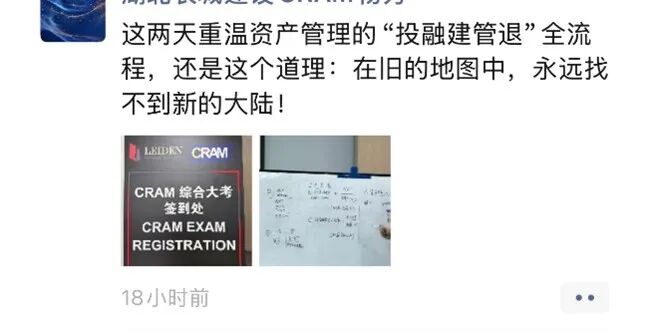 成长共鸣:“出差、考试、汇报连轴转,一整年学习‘燃尽但超有收获’。”即便学习与工作压力交织,学员仍在CRAM中感受到“知识转化为职业底气”的力量,突破“经验瓶颈”,从单一“执行者”向“资管决策者”迈进。