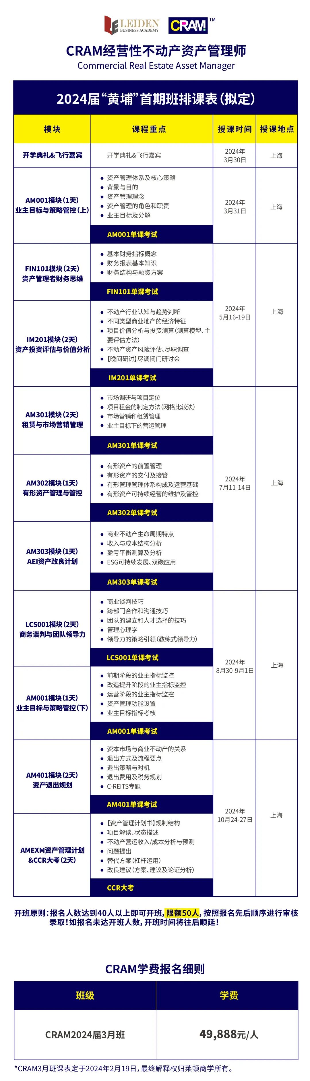 2024年3月30日至3月31日,中国首个本土不动产资产管理系统化课程CRAM在莱顿商学教学中心(上海)正式启动。
