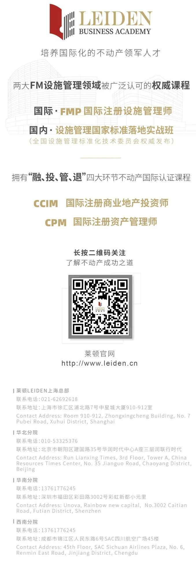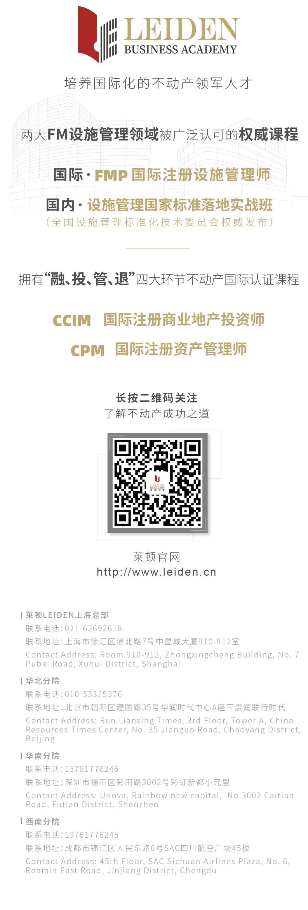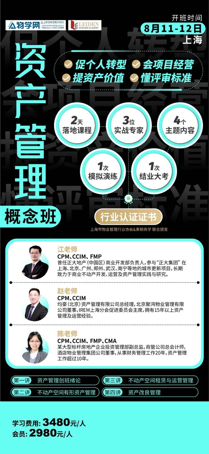 Agnes老师则从设施管理在商业房地产全生命周期中的作用和大家分享商业房地产视角下设施管理与物业管理不同、从不同维度看商业房地产设施管理目标(所有持份者:业主/租户/占用者) 、设施管理在商业地产的功能以及设施管理如何在商业地产全生命周期中的价值与案例分析。作为一门设施管理概念班,上海物业管理行业协会及莱顿商学希望同学们学习本课程后了解FM的概念、体系并通过国内外物业企业转型设施管理的经典案例,并且能够及时了解掌握FM发展趋势、把握设施管理的转型契机,并探讨通过设施管理赋能为业主提供更高品质的设施管理及增值服务。三期班将于2023年9月上海举办。