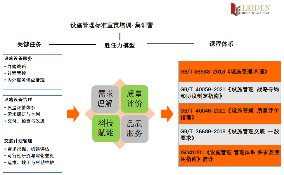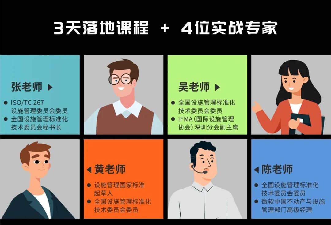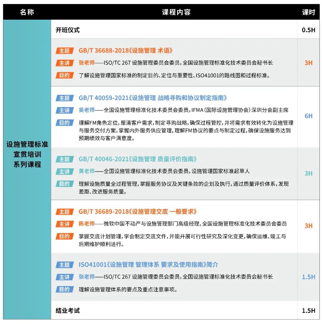 面对上述难题,与其被困扰,不如速速来参加我们的训练营,您将掌握设施管理国家标准与要求,并能有效破解当前存量物业的设施管理难题,促进业务持续改进、强化企业竞争力、提升商业价值与降低经营风险,实现对业主投资方的业绩承诺。