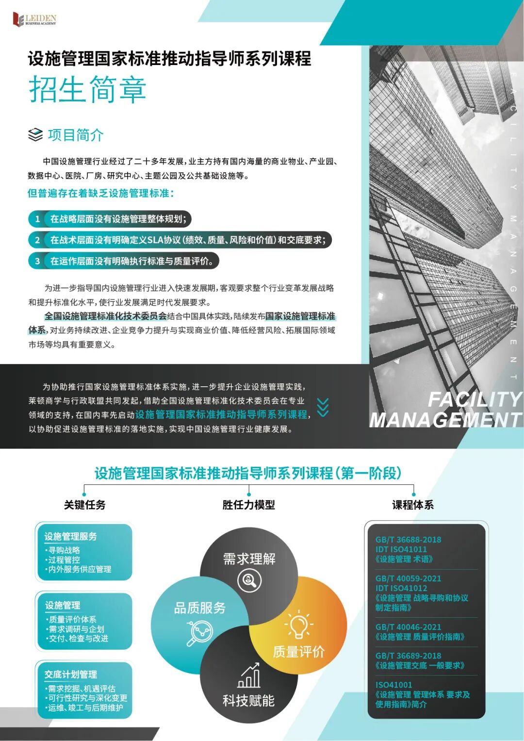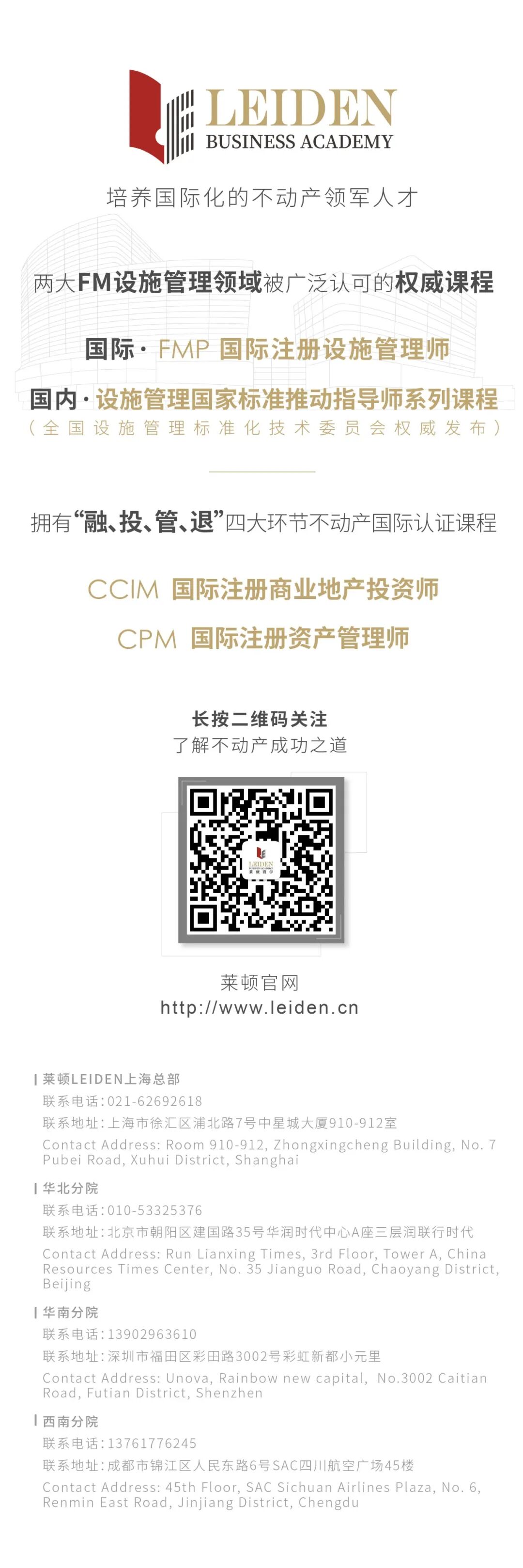 莱顿商学为协助推行国家设施管理标准体系实施,进一步提升企业设施管理实践,与全国设施管理标准化技术委员会达成战略合作,在国内率先启动设施管理国家标准推动指导师系列课程,以协助促进设施管理标准的落地实施,实现中国设施管理行业健康发展。