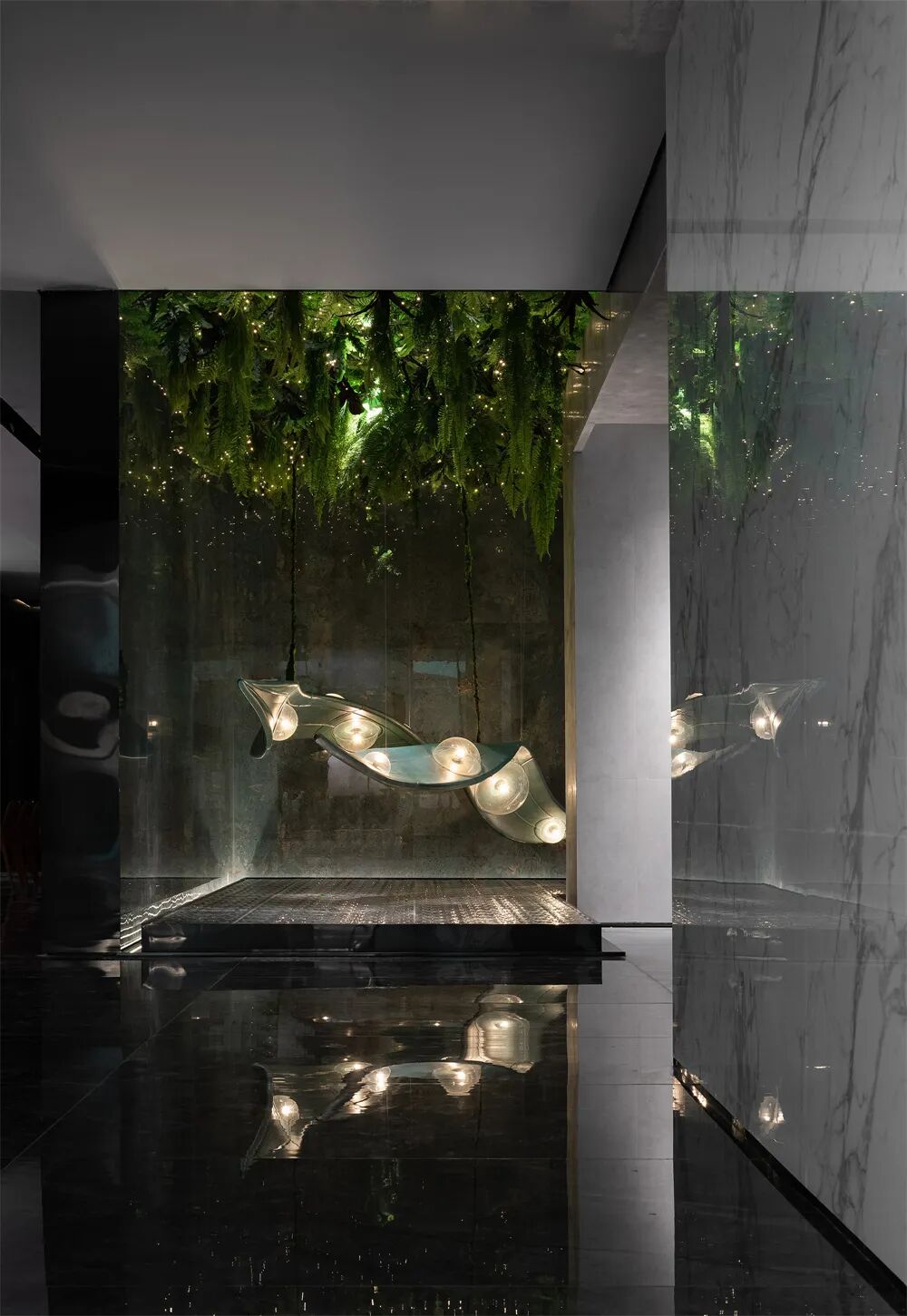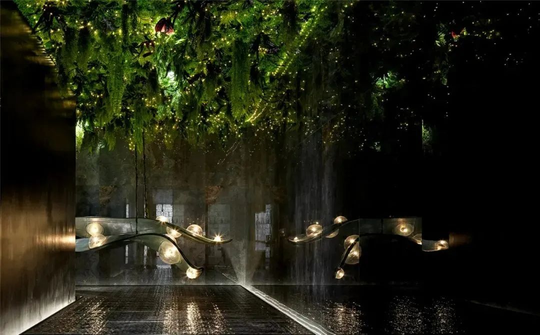 「时空秘境」艺术装置,是设计师用波纹不锈钢以及星空元素营造一个超现实的「时空秘境」。绿色玻璃钢制成的装饰仿佛太空飞船,在璀璨的星空里游弋,藤蔓从空中垂吊下来,外星生物像萤火虫一样散发出魅惑的光芒。