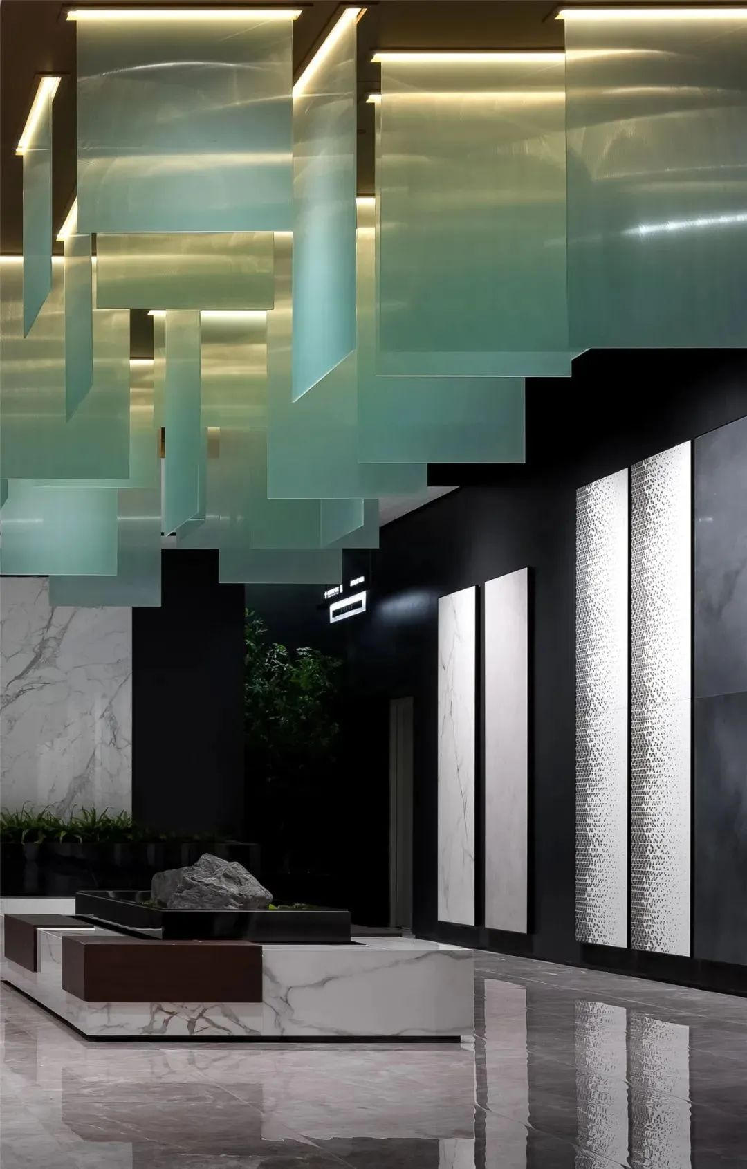 「银色的天空树」造型是上下呼应的休息区,从天花的设计来说,运用银箔使得波浪镜面不锈钢材质,增加空间的通透感与层次性,也呼应空间的童趣色系。