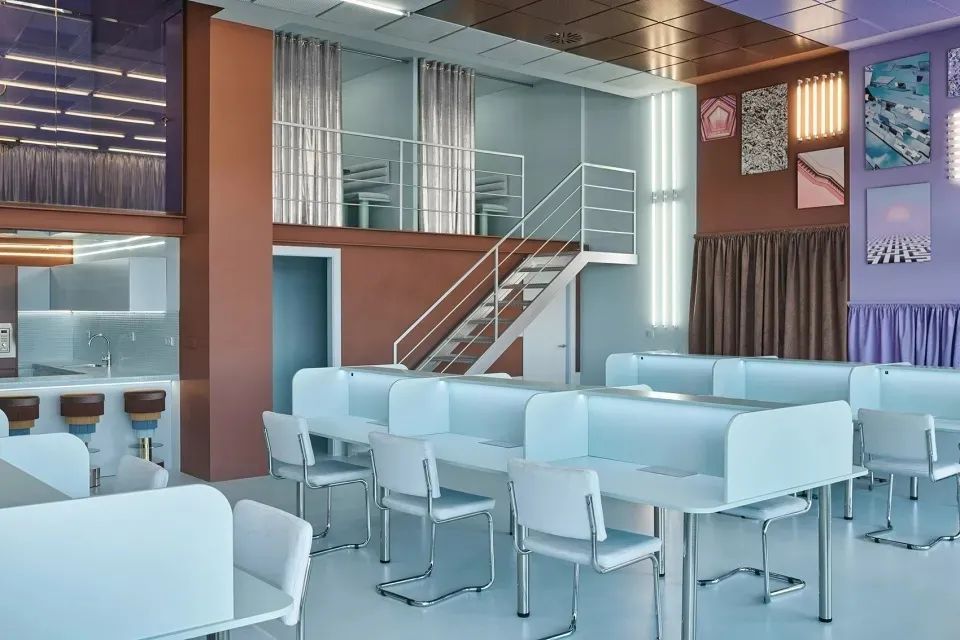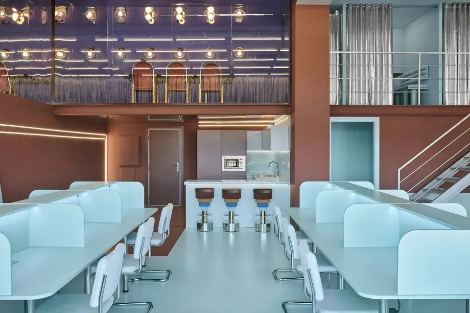 Cabinette共享办公空间为创意和艺术相关的工作人员提供空间。天鹅绒家具充满设计感,洋溢着60年代的复古气息,让人沉浸在宁静的蓝色与绿色空间中。