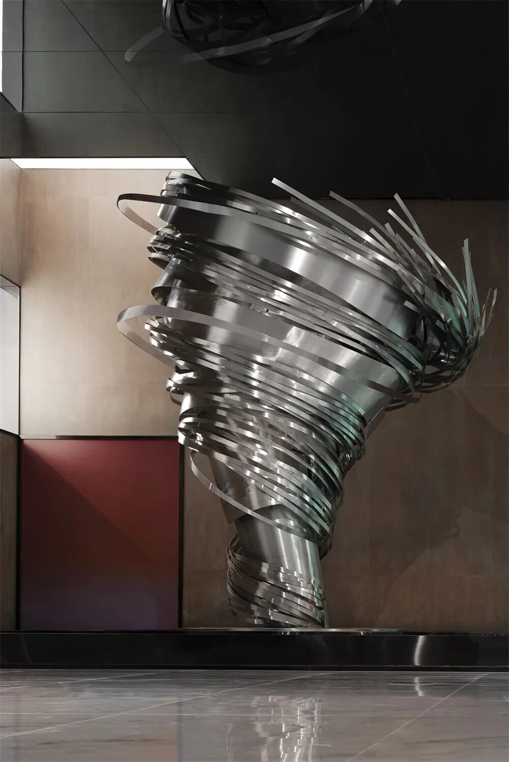 名为「风再起时」的不锈钢艺术装置表达了品牌发展的迂回曲折之路,也凸显了空间的主题。龙卷风通过卷起地面尘土而变得有形,并且极具力量性,又具有某种形式上的视觉美和强烈动感。