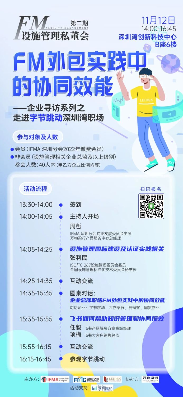 11月12日(星期六)第二期“FM 设施管理私董会”如约而至,我们一起走进字节跳动深圳湾职场。扫码海报中二维码进行报名。