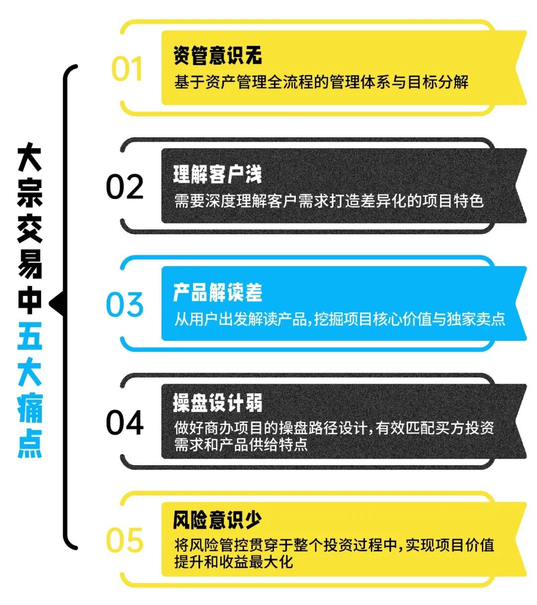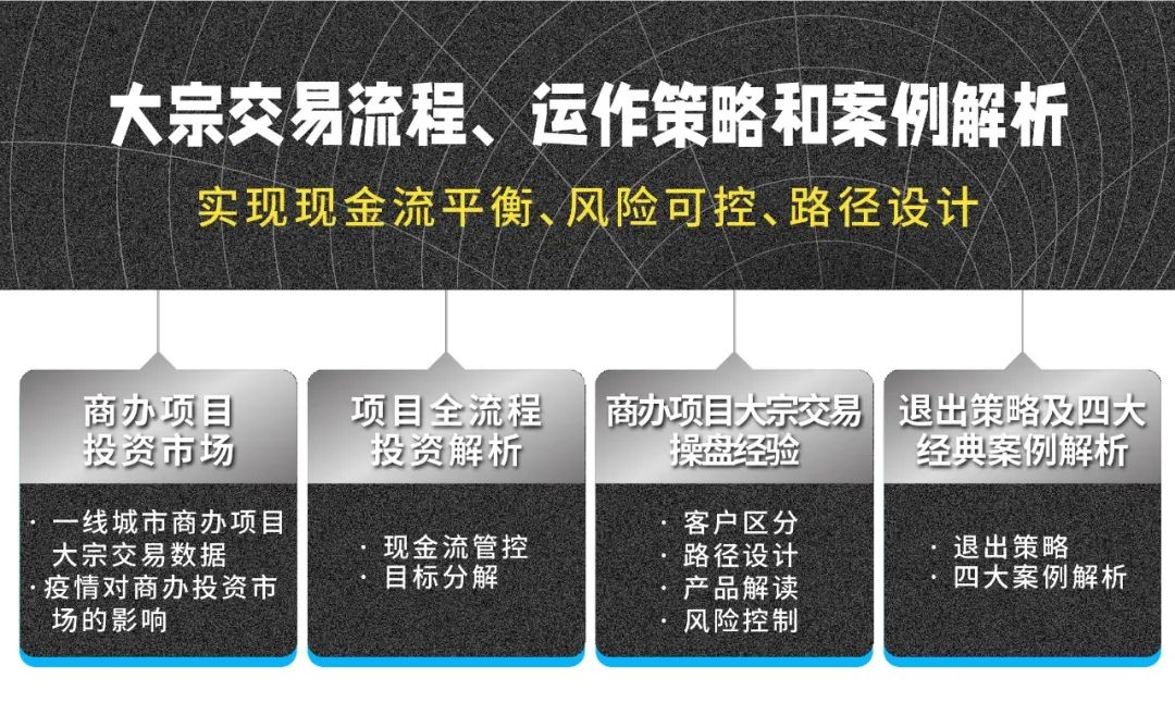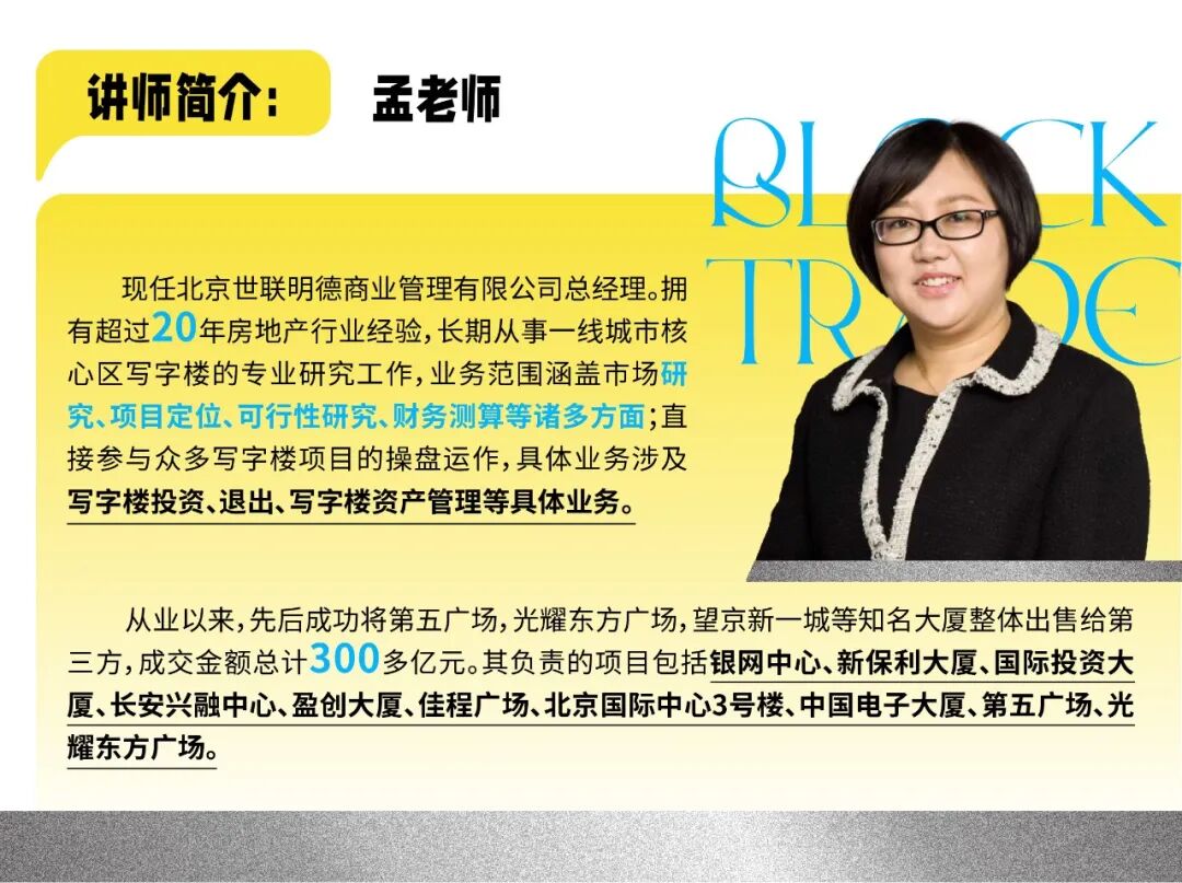 本次课程,将结合实战案例与大家分享:关于写字楼(商办)项目投资市场的大宗交易数据、写字楼全流程投资的核心流程与目标分解、(商办)项目大宗交易操盘的四大要点。课程致力于带领各位学员,系统掌握写字楼(商办)项目大宗交易的操盘要点与核心技巧,助力房地产企业把握下半年写字楼市场复苏的新机遇、开拓新局面。